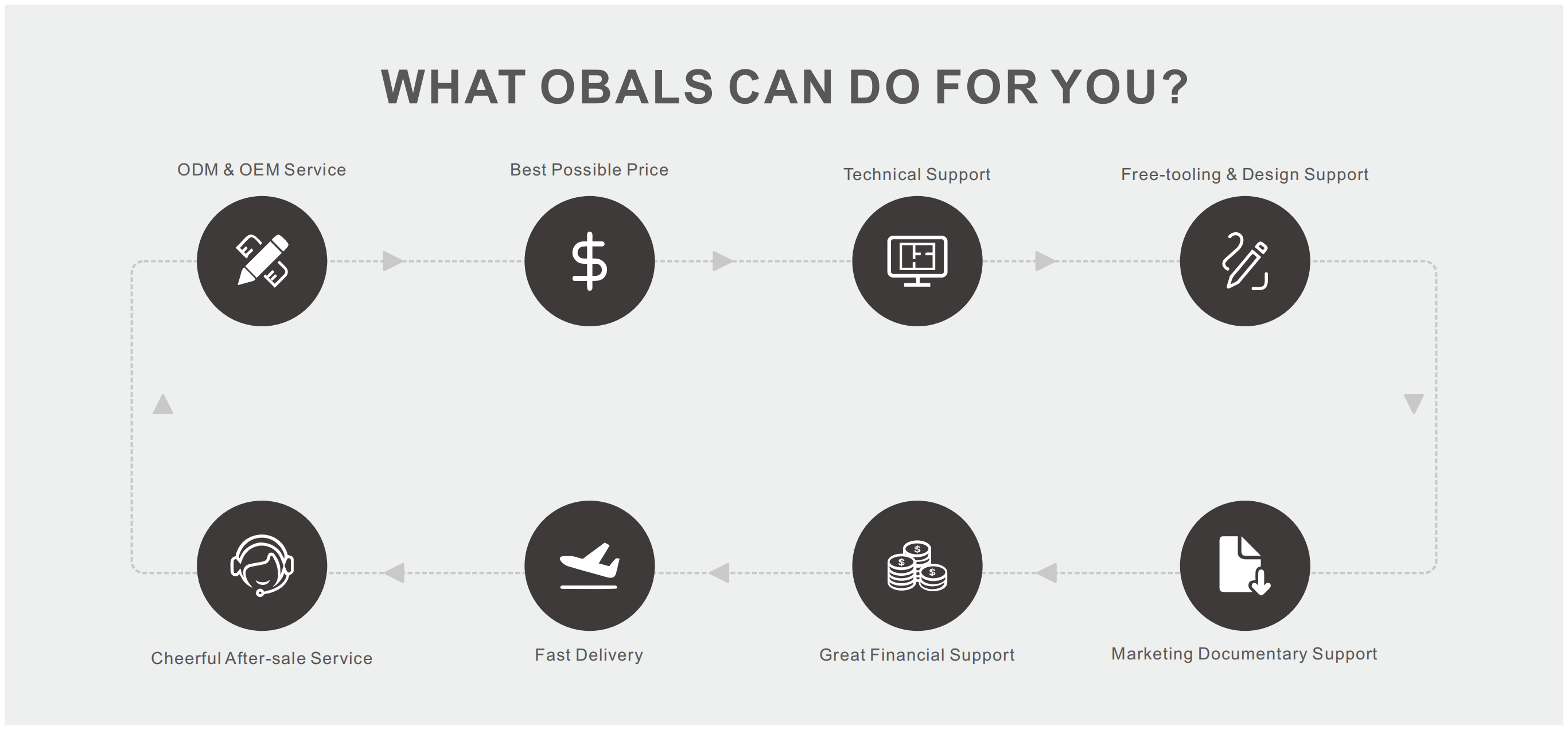 If you have any ideas of new product, OBALS not only can help you make exclusive design for your market according to your ideas, but also can give discount support on tooling andeven free tooling support, based on a long-term cooperation and a big order volume.